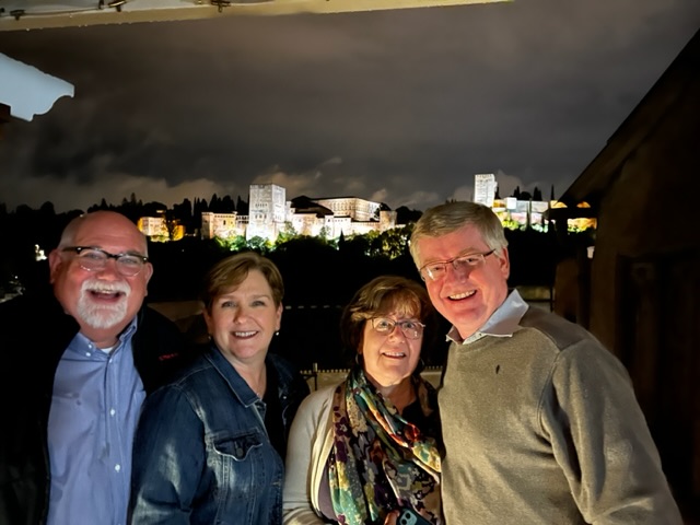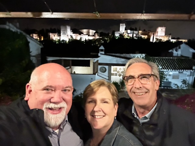 After touring the Alhambra in the rain on Monday afternoon, we met my friend Jose Antonio for dinner. He had made us a reservation in the Albaicin quarter of Granada with a great view of the Alhambra. Three hours after sitting down to dinner we took these pictures with the Alhambra in the background. Afterwards, the wimps went to bed but Jose Antonio and I went out for a gin and tonic made with a Spanish gin. I need to find a bottle to bring home